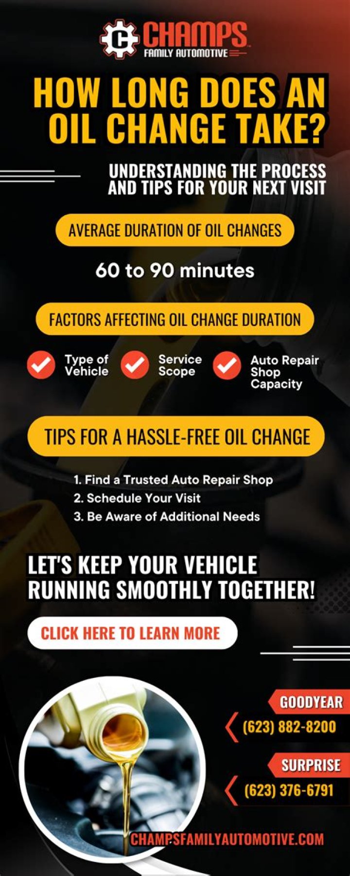 If you bring your vehicle in, expect to wait between 15 and 45 minutes for an oil change. If you take your vehicle to a quick lube shop and can be seen immediately, the process can take as little as 15 minutes.