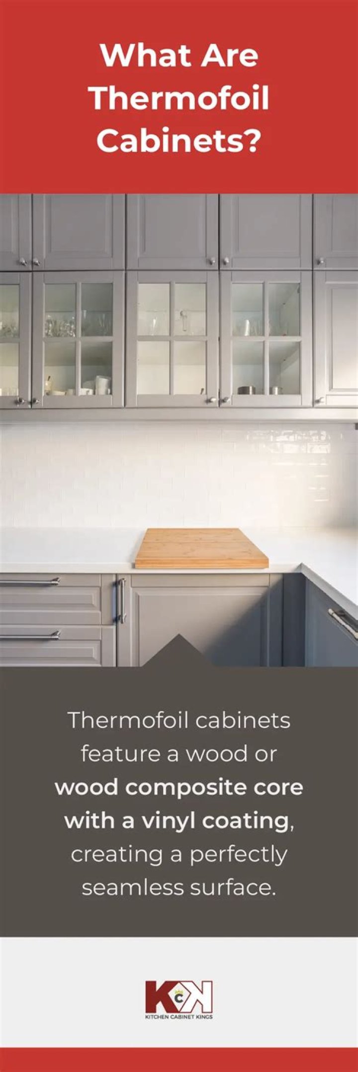 Thermofoil is a surface finish applied to cabinets by multiple manufacturers. It is a plastic material which is thermoformed to the profile of an underlying engineered wood core such as medium-density fiberboard. … Thermofoil cabinet doors can be a solid color or imitation wood grain.