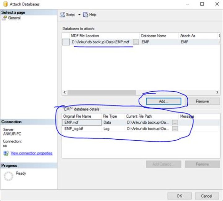Right click the database name->tasks->detach and click OK on the database detach window. 3. Right click databases->attach->add and point to the mdf file. It will automatically take the ldf file to the attach databases window.