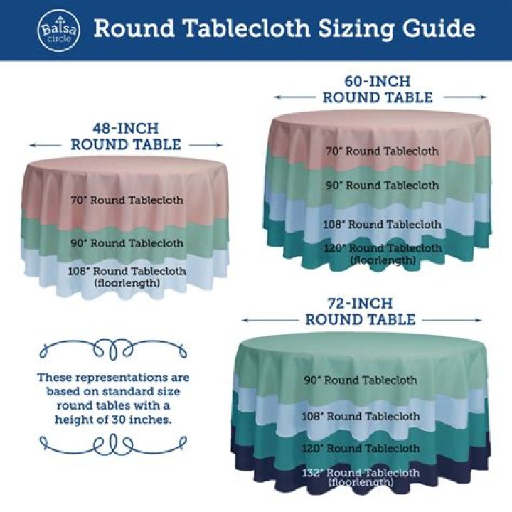 48 inch or 4 ft round tables – 108 inch round table cloths. 60 inch or 5 ft round tables – 120 inch round table cloths for a full drape, 108 inch round for some leg room, 90 inch round for a drop that goes halfway to the floor. For a snug fit, we also recommend using 5 ft spandex table covers.
